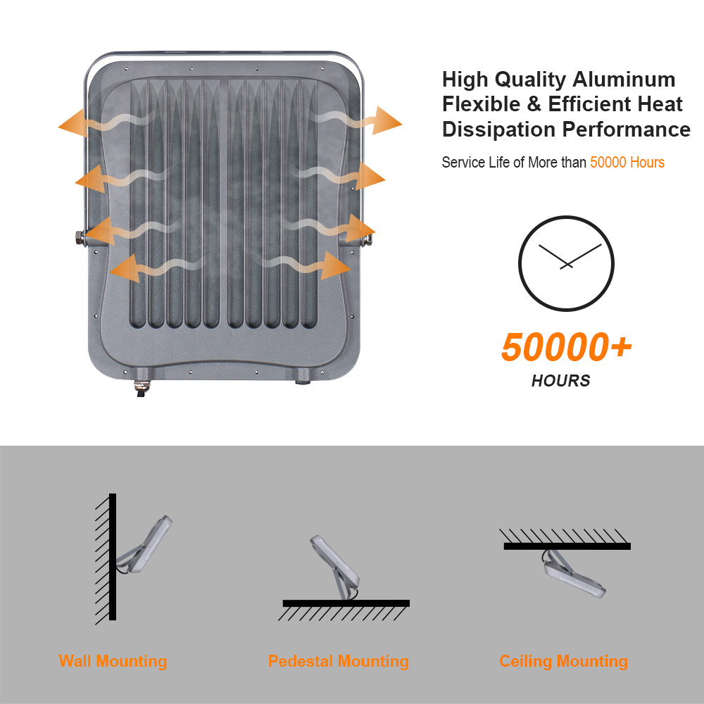 [Verimli Isı Dağılımı, IP65 Su Geçirmez] LED dış mekan projektör, hava temas alanını artırmak, ısı dağılımını etkili bir şekilde hızlandırmak ve dış mekan LED projektörün hizmet ömrünü uzatmak için aerodinamik bir soğutucu tasarımı benimser. Güvenlik ışığı cilalı ve elektrostatik olarak işlenmiştir, paslanması ve solması kolay değildir. Döküm alüminyum lamba gövdesini benimseyin, IP65 Su Geçirmez işlevine sahiptir, uzun hizmet ömrü, lamba değişikliklerinin sayısını azaltır, böylece manuel çalışmayı azaltır.